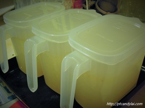 後來考慮到環保問題,改用一公升膠杯儲存。