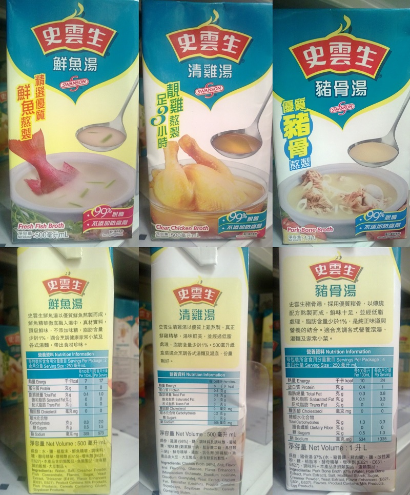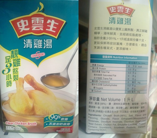 用預製雞湯做湯底煮餸,方便之餘又易煮出食館小菜的味道,但也易忽略它的成份對身體的影響。包裝盒上「不含防腐劑」、「不含人造色素」、「脫脂」的標語轉移消費者視線,卻令人輕視鈉的含量。比較4款於惠康超市有售、不同產地的盒裝預製清雞湯,本地最具知名度的「史雲生清雞湯」其鈉含量是4款之冠,如果用一盒1公升煮湯供四人食用,一人攝取1000毫克,已佔一半每天建議攝取量(2000毫克),光喝這口湯,從其化食物可攝取鹽份餘額不多,極易超標。它跟其他罐頭食品一樣,加重鹽份可延長保質期,患高血壓人士更需提高警覺。