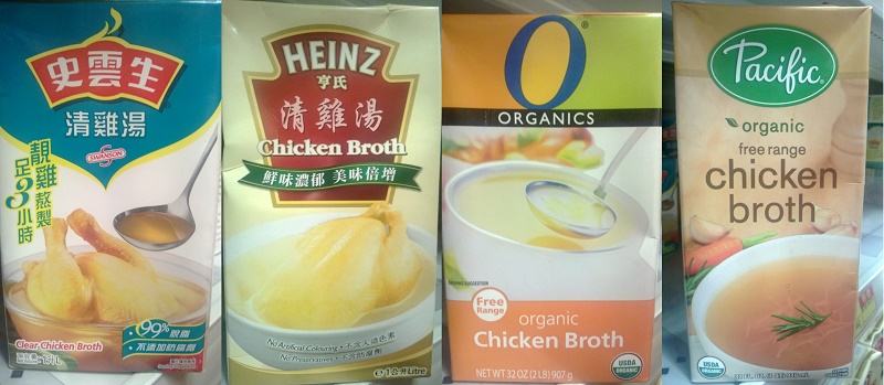4款盒裝清雞湯非一樣份量,根據盒上營養資料全轉換成每1公升之含量,方便比較,兩款美國製賣有機成分,以非圈養的走地雞生產,鈉含量較史雲生差不多低一半,售價亦貴一倍或以上。