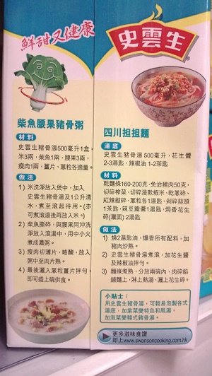 清雞湯之外,史雲生尚有兩款最常見的湯底,順道拿來比較一下,豬骨湯的鈉含量比清雞湯還高,1公升包裝高達5340毫克,包裝盒上推介食譜柴魚腰果豬骨粥,建議用一盒500毫升,鈉含量2670毫克,說成「鮮甜又健康」,還看全天飲食配搭。